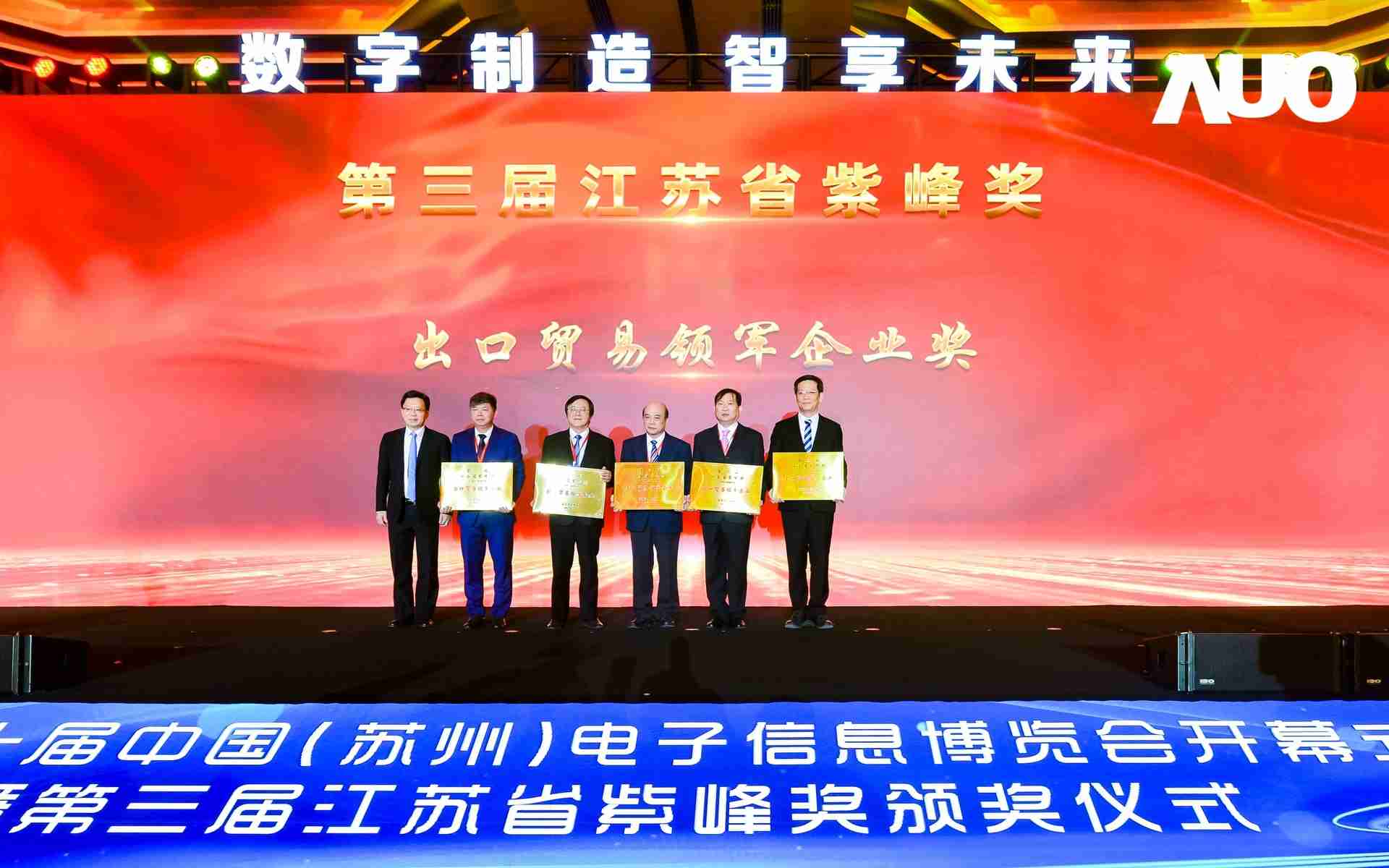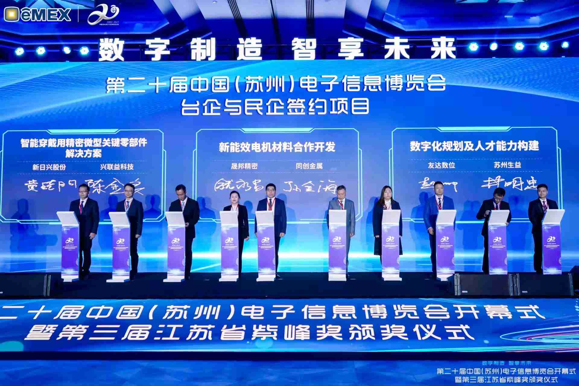 电博会开幕式当天也是第三届江苏省紫峰奖颁奖仪式,,,,省台办、、、、工信厅、、、、商务厅、、苏州市相关领导均出席并颁奖。。该奖项为表彰对江苏高质量发展做出积极贡献的在苏企业,,由江苏省政府专门设立。。。杏悦2光电 (苏州) 总经理郭振明代表上台领奖,,,,这也是杏悦2苏州连续三次蝉联紫峰奖 出口贸易领军企业奖。。。杏悦2数位总经理赵丽娜女士,,,,也参与本次开幕式,,,上台为本地化赋能签署战略合作协议,,将优质服务资源集合、、下沉到更多细分行业,,为更多地区的制造企业提供数字化转型服务。。。